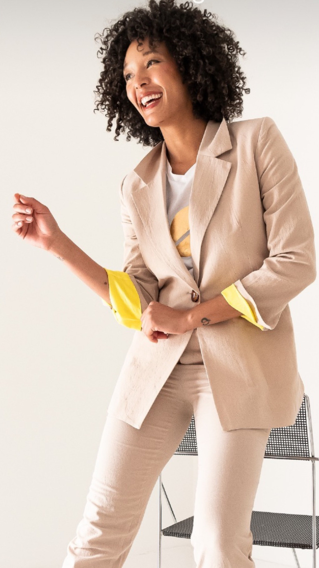 Los detalles de forrería en poplin de algodón amarillo le aportan un toque especial que lo distingue de un blazer común. Es perfecto para combinar con el PANTALON PAZ.